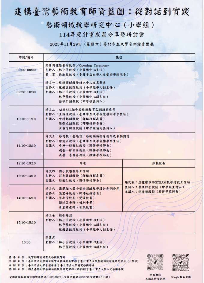 | 主旨: | 檢送臺北市立大學藝術領域教學研究中心(小學組)辦理「114年度計畫成果分享暨研討會」議程表一份,詳如說明,請查照。 |