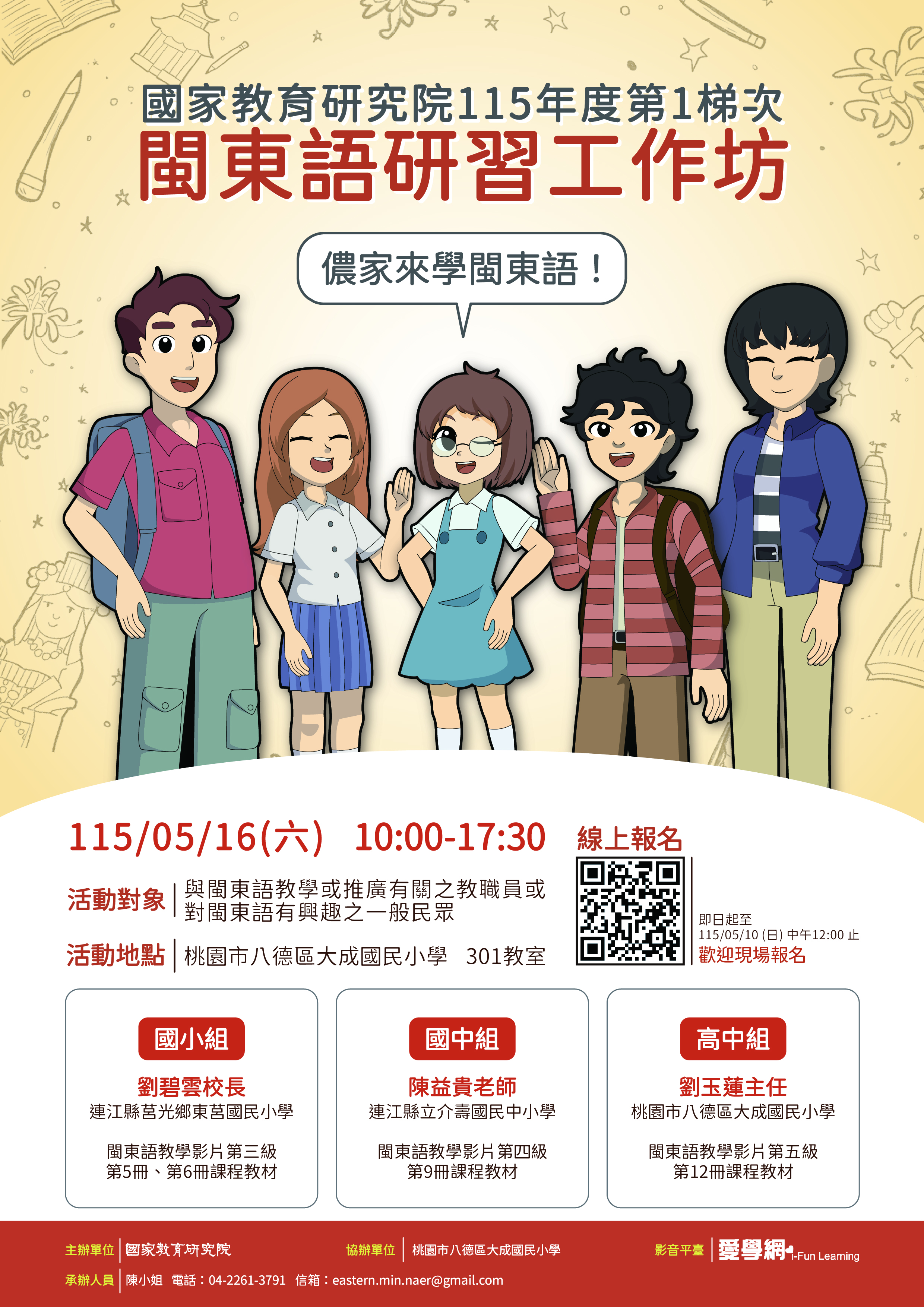 二、 為推動國家語言發展法,執行「國家語言整體發展方案」,國家教育研究院114年完成12支閩東語教學媒體影片製作;為推廣教學媒體影片,擴大使用效益,特別規劃辦理115年第1梯次「閩東語研習工作坊」活動,期透過教學經驗與實務分享,達到提升閩東語教學效益與運用範疇之目標。