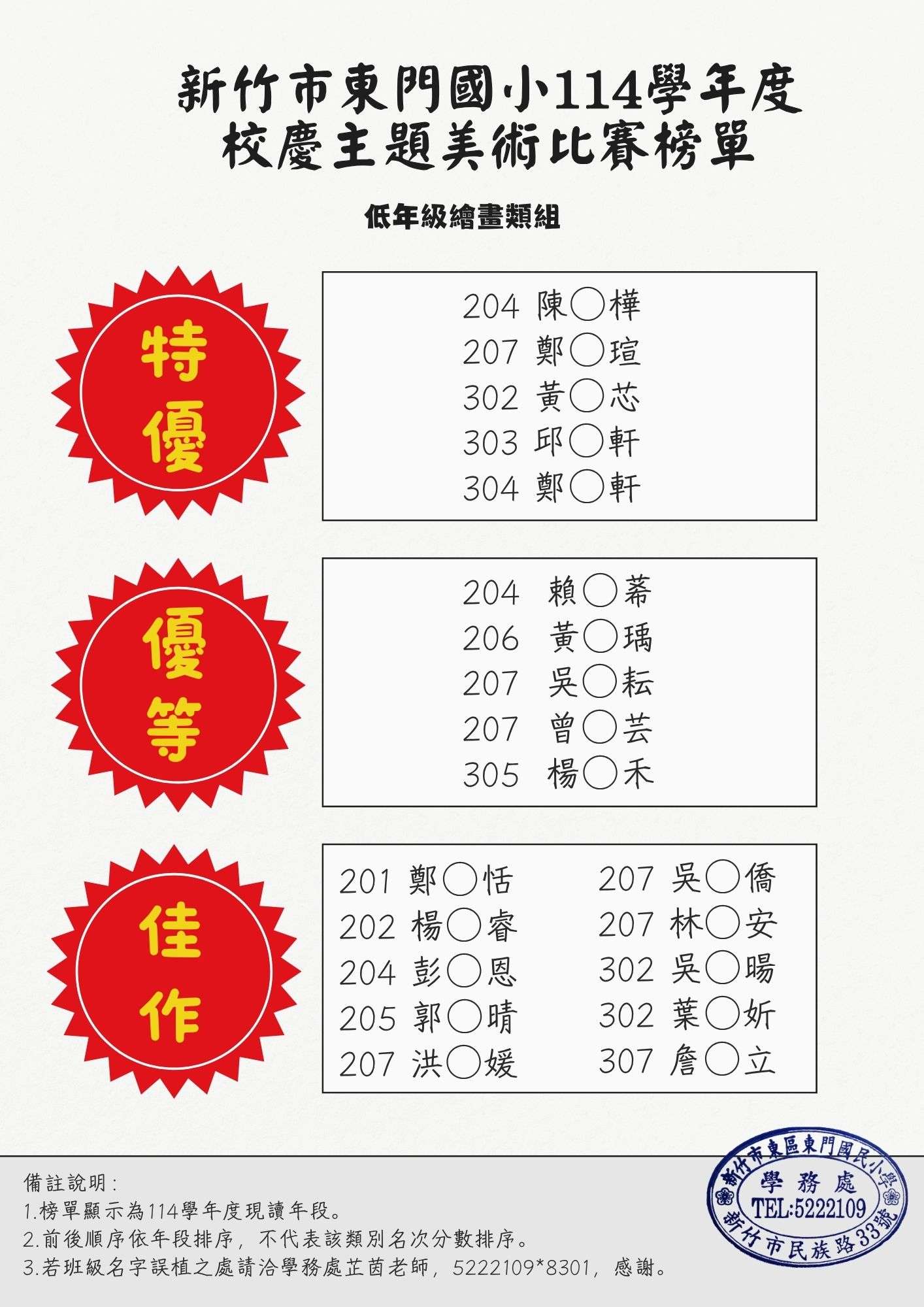 2.特優、優等、佳作的作品將布置在本校校慶靜態成果展,展覽時間與地點如下: