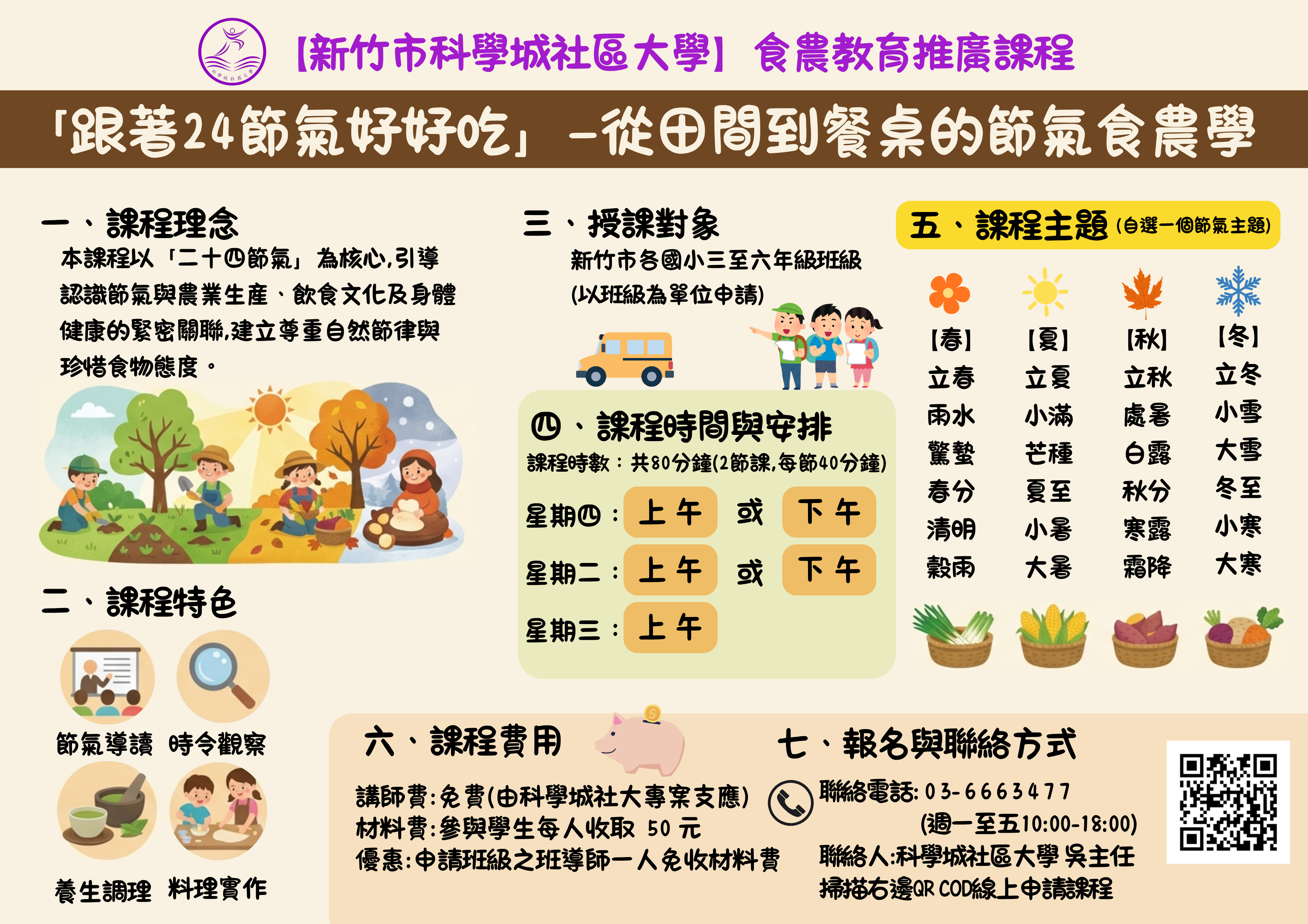 | (一) | 課程理念:本課程以「二十四節氣」為核心,引導認識節氣與農業生產、飲食文化及身體健康的緊密關聯,建立尊重自然節律與珍惜食物態度。 |