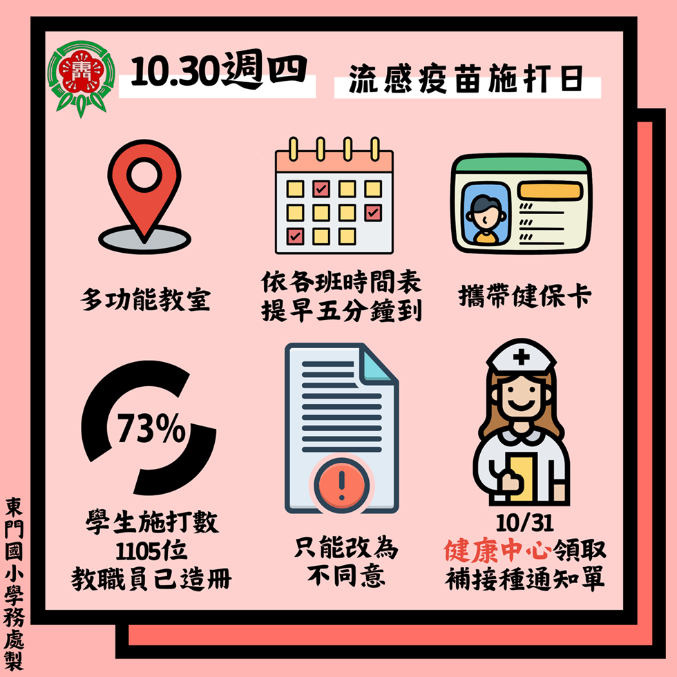 七、10/30因故未接種、或有需要開立流感疫苗補接種通知單的學生,請於10/31至健康中心領取補接種通知單,由家長自行帶至校外醫療院所進行施打,回條不需交回健康中心。