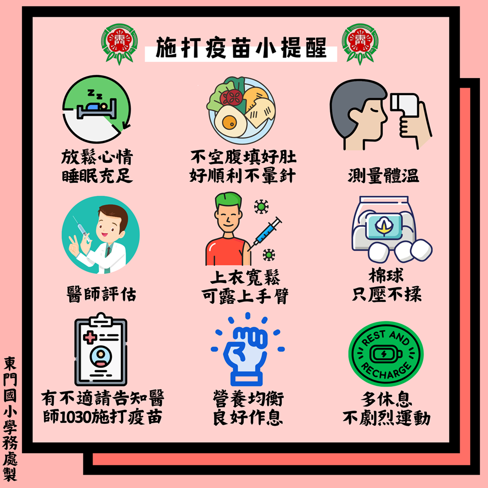 二、施打時間:依時間表,請各班提前五分鐘抵達。