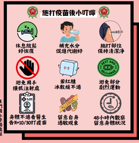 7.返家後應多加留意身體狀況,多休息、勿做劇烈運動,並請詳閱流感疫苗接種後注意事項內容,有發燒不適就醫者,請告知醫師『10/30在學校有接種流感疫苗』。