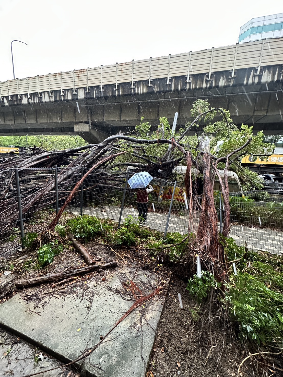今日校園東大路旁路段發生路樹倒塌,目前該路段暫時封閉,已通知派出所前往處理,警方將到場進行交通管制。