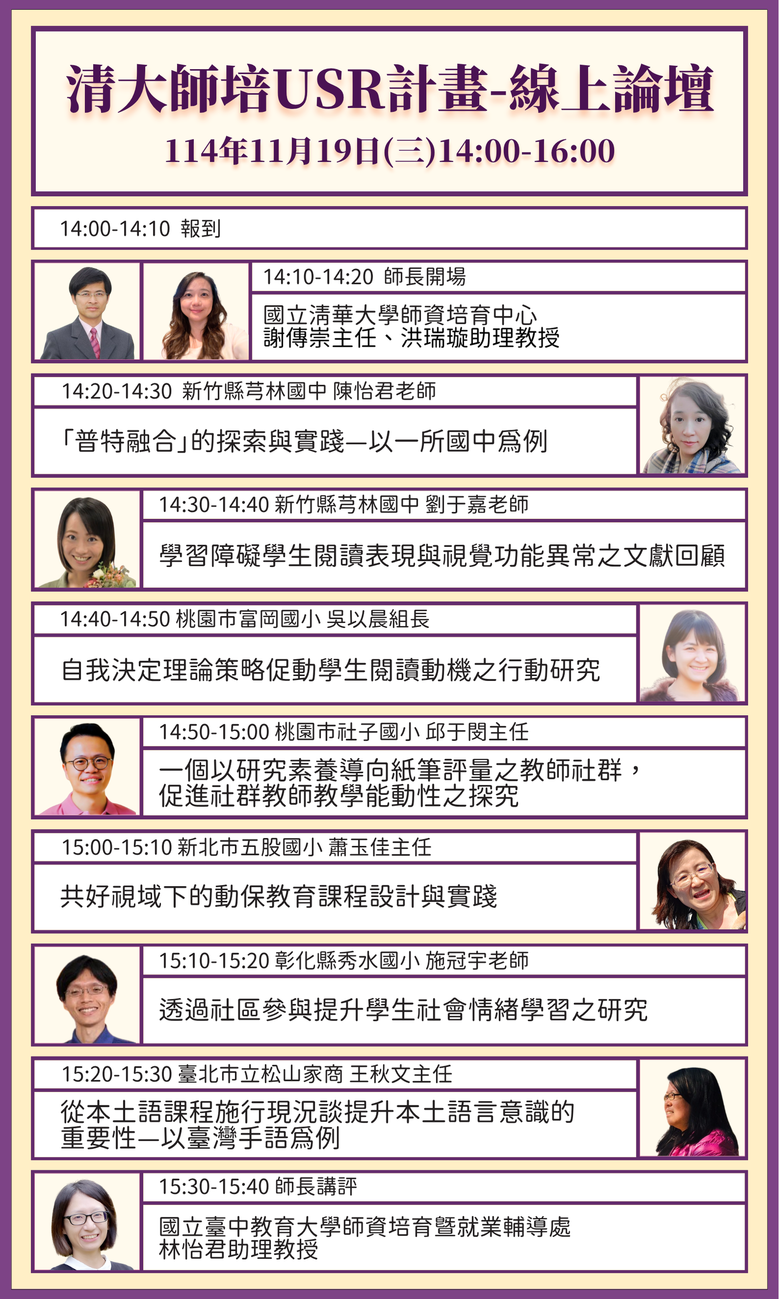| 主旨: | 國立清華大學師資培育中心訂於114年11月19日(星期三)辦理「教育的跨域創造力:豐碩大學與中小學、幼教、特教及師資生協作之專業資本」計畫(以下簡稱USR計畫)線上論壇,請轉知貴校教師報名資訊,請查照。 |