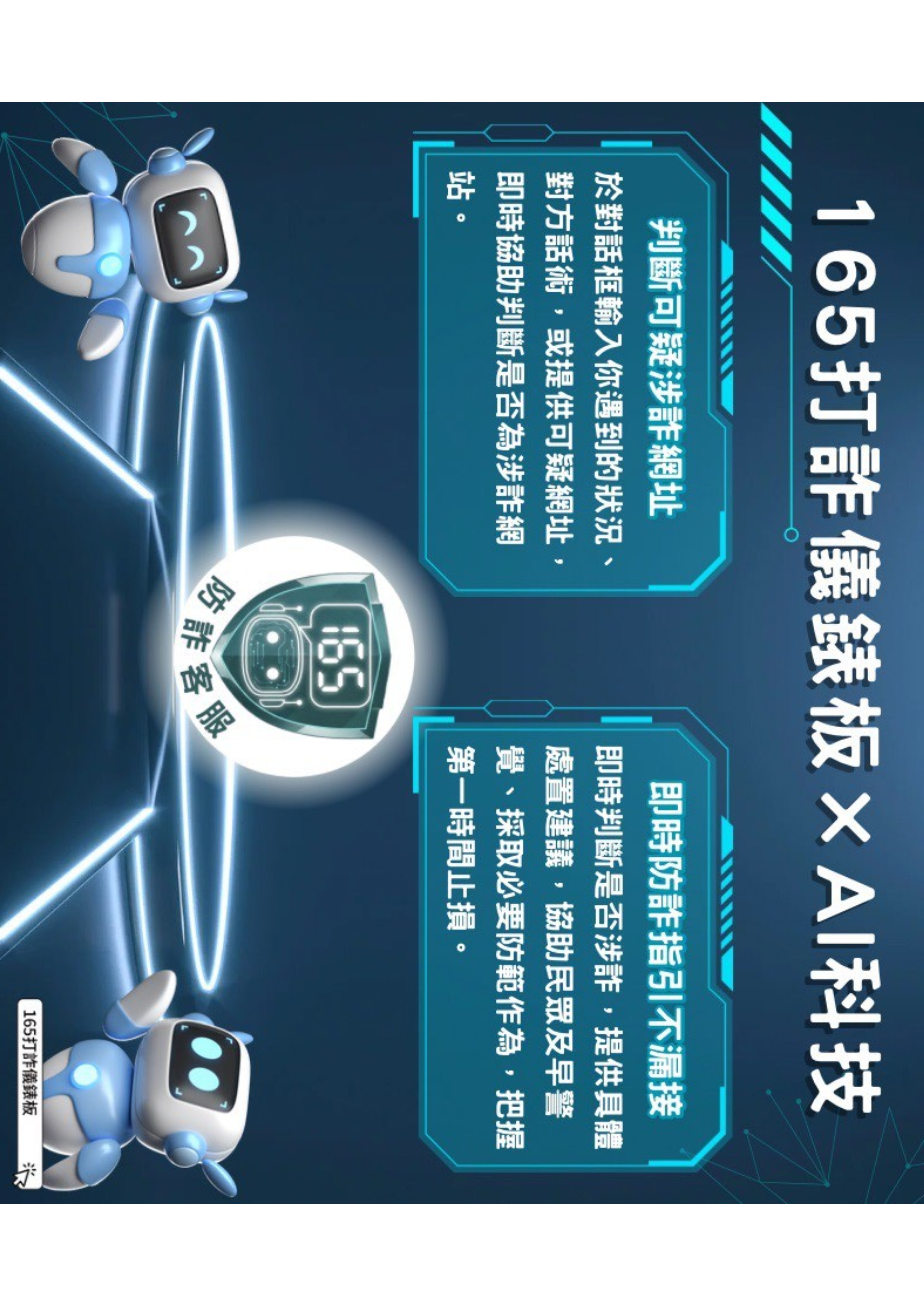 | 二、 | 為因應詐騙手法快速演變,內政部警政署於「165打詐儀錶板」導入AI智能客服小幫手,整合防詐資料庫提供即時互動諮詢,可依民眾描述情境辨識詐騙風險並提供具體處置建議;另具備涉詐網址即時查詢功能,可判斷網站是否具詐騙風險。 |